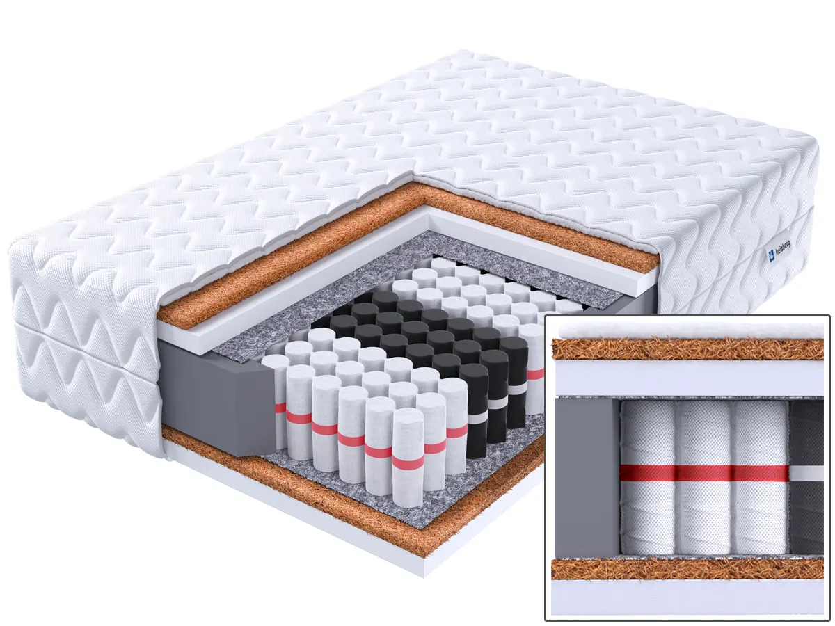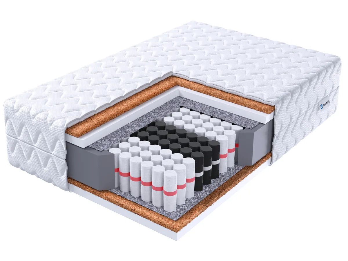- Dwustronna konstrukcja H4: obie powierzchnie materaca zapewniają wysoką twardość, ale różnią się ułożeniem warstw.